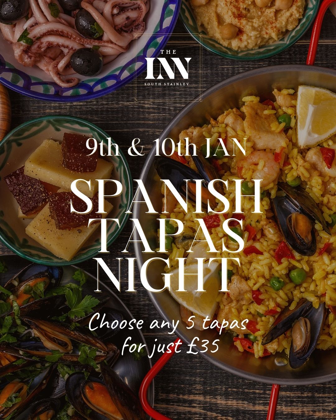 Join us for Tapas Night and enjoy a selection of Spanish-inspired dishes including: - Roast chorizo, meatballs, gambas pil pil - Vegan options like baked beetroot and traditional tortilla - Grilled seabass fillets and minute steak with chimichurri Sell full menu HERE Five dishes for £35.00